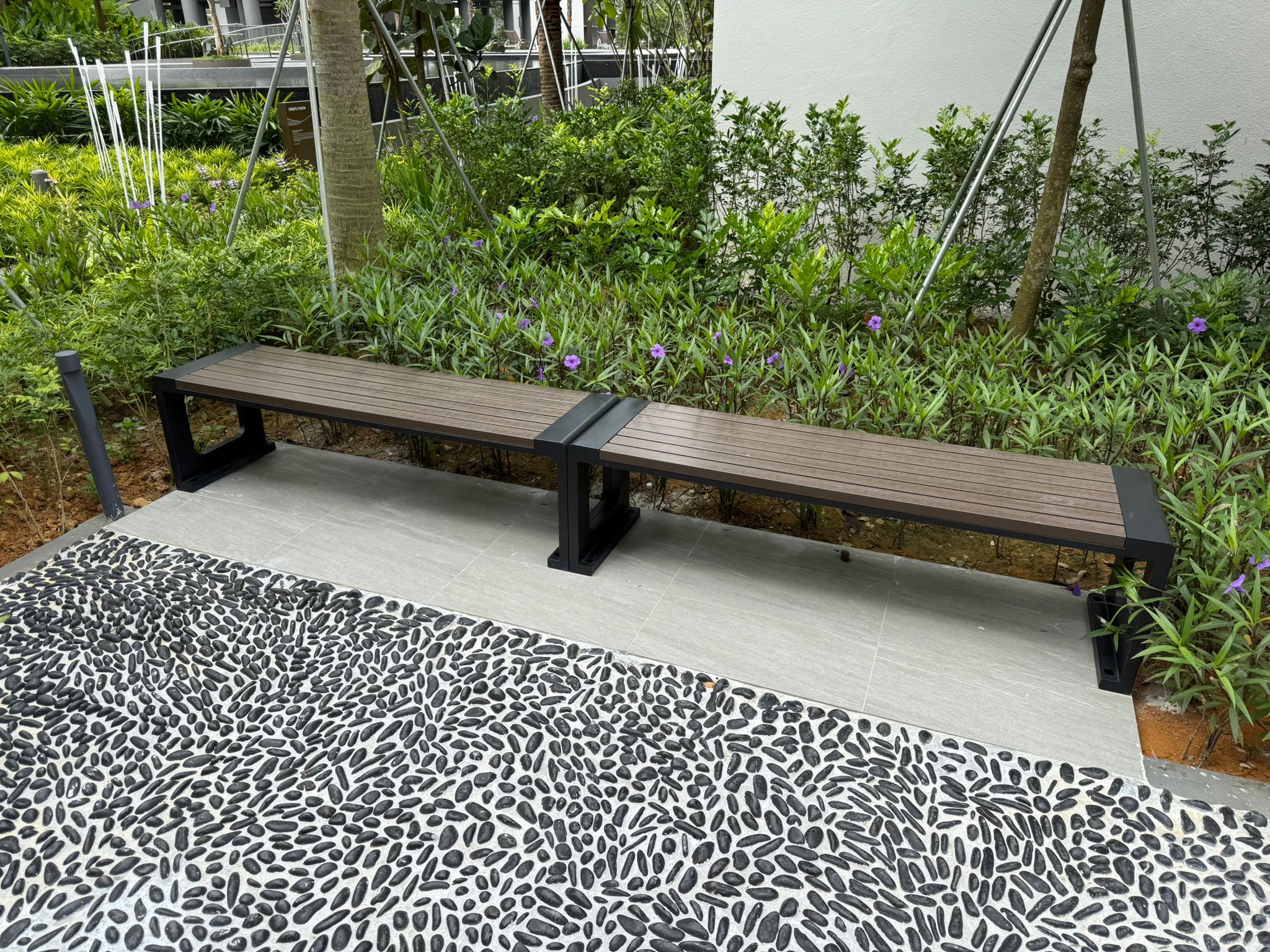 A) Material: Cast Aluminium Ends with Malaysia Imported Natural KAPUR Timber Slats. Please contact us directly for enquires on the optional material.